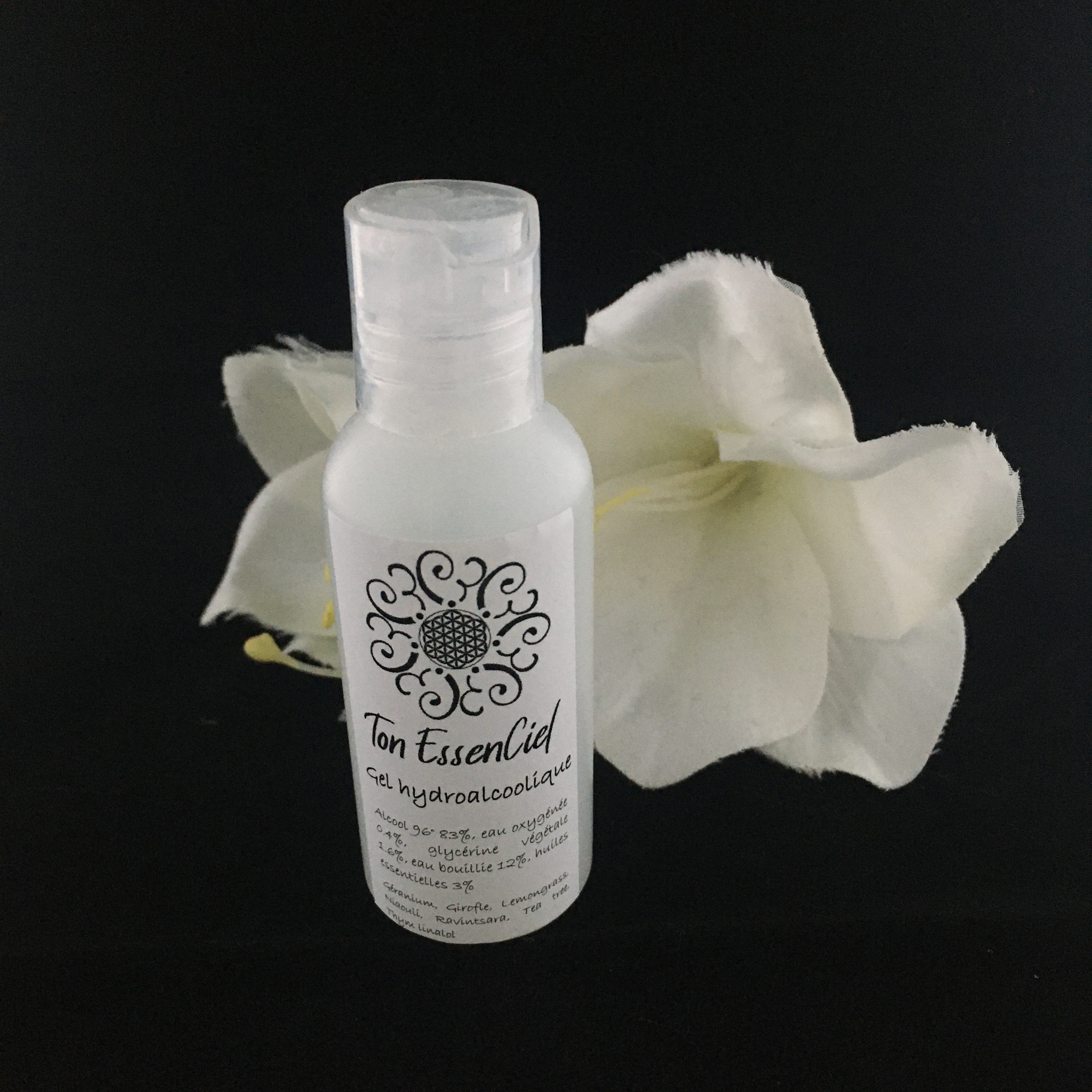 Gel hydroalcoolique enrichit aux huiles essentielles et réalisé en suivant la recette de l'OMS (60 ml).